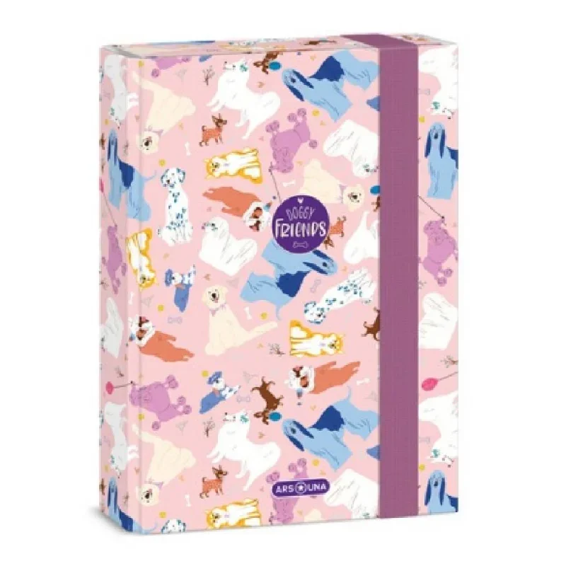 Ars Una A5 füzetbox Doggy Friends  A/5 méretű füzetbox kiskutyás grafikával Kemény és tartós kartonból 4 cm-es gerincvastagsággal 7 mm-es gumipánttal zárható Füzetek, iratok tárolására tökéletes  Méret: 160x220x35 mm